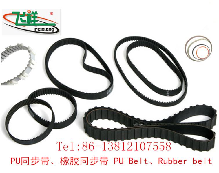 3.同步带 按材质可分为氯丁橡胶加纤维绳同步带,聚氨酯加钢丝同步带,按齿的形目前主要分为梯形齿和圆弧齿两大类,按带齿的排布面又可分为单面齿同步带和双面齿同步带。 飞祥科技的聚氨酯同步带由热塑性聚氨酯及高强度钢丝组成。它具有高强度、高韧性、低噪音、变形小、耐磨、耐油、耐酸、耐老化的性能。聚氨酯同步带瞬间可承受110°C的高温,产品无污染性。在使用时无需润滑。